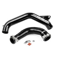 The factory plastic and rubber turbo outlet pipe is a small and restrictive 38mm pipe that has shown to melt, deform, and cause boost leaks under extreme conditions. The APR System remedies this by upgrading the system to a larger 60mm aluminum pipe, along with a new multi-ply fluorosilicone coated turbocharger outlet hose. APR EZ-Flow stepped lip hoses provide a smooth transition from hose to pipe, and the included T-bolt clamps ensure a strong and leak-resistant seal at the pipe. All brackets are TIG-welded for a strong and precise fit, and the pipe is coated black. A protruding lip at the edge of the pipe helps prevent hose slippage. This pipe is a direct fit to the APR DTR6054 Turbocharger and the APR or OEM intercooler hose. APR Recommends upgrading the intercooler hoses as well for maximum performance and reliability.