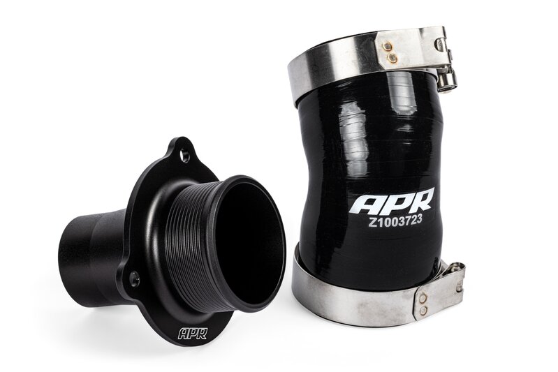 The APR Turbo Muffler Pipe and Turbo Outlet Hose takes a multiple step approach to upgraded these components which results in a much larger and smoother airflow path than simply upgrading each component on its own. The turbo muffler is designed to soften sound from the turbocharger, taking away the sounds enthusiasts enjoy. We do away with this and in doing so we eliminate a restriction path that causes turbulence and reduces performance. The outlet of the muffler pipe has a cross sectional area 66% larger than stock. By upgrading both the hose and muffler pipe at the same time, we're able to dramatically increase the size of the system to match the size of the other hoses and pipes in the charge air system, just like on the higher output Golf R / S3 Models. Unlike some components on the market, the APR system retains the critical PCV vent path on the muffler pipe for necessary for proper engine operation. Because a critical seal is not necessary due to the need for a PCV path, the muffler pipe is created from a solid piece of billet aluminum with a satin black finish and no need for extra gaskets.