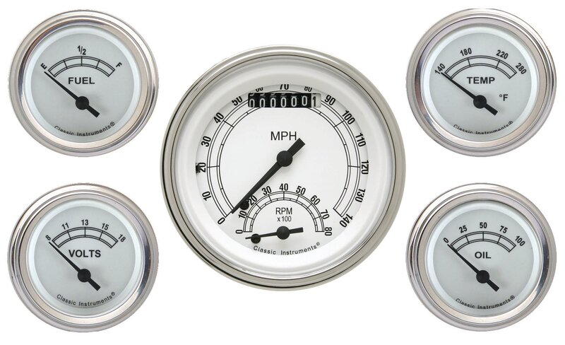 Classic White 3 3/8" Ultimate Speedometer, 2 1/8" Fuel, Oil, Temp, Volt with Stainless Low Step Bezels and Flat Glass Lenses. Ultimate speedometer features a built-in ECM filter signal switch.