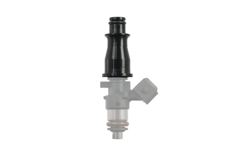 This fuel injector adapter allows a 1/2 length (34 mm) injector with a 14 mm top O-ring to be installed as a full-sized (60 mm) injector, fitting a fuel rail with an 11 mm O-ring bore.