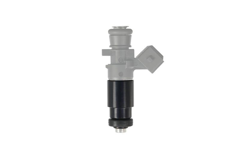 This fuel injector adapter allows a 1/2 length (34 mm) injector with an extended tip, and 14 mm top and bottom O-rings, to be installed into a Nissan intake manifold using a Nissan base O-ring.