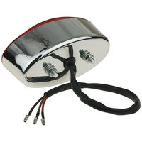 Fender mount taillight with oval-shaped red lens and chrome-plated plastic body. Dual-filament bulb with 5 Watt tail light and 21 or 10 Watt brake light depending on Voltage. Clear bottom-side license plate illumination window.
