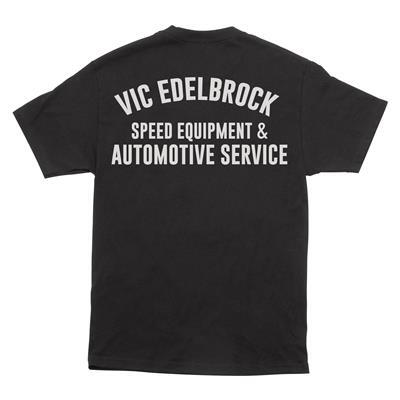 The Edelbrock Vic's Service T-Shirt is a heavier weight, 100% cotton jersey pre-shrunk shirt. The shirt features logo graphics on the left chest and back. This is a classic regular fit t-shirt.