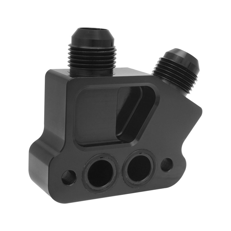 Proflow's Billet oil cooler adapters replace the OEM oil filter housing. These oil filter bypass adapters allow for the installation of a remote oil filter and optional oil cooler. Their billet construction is black anodized and stainless hardware is included. They use O-ring seals for a leak-free installation.