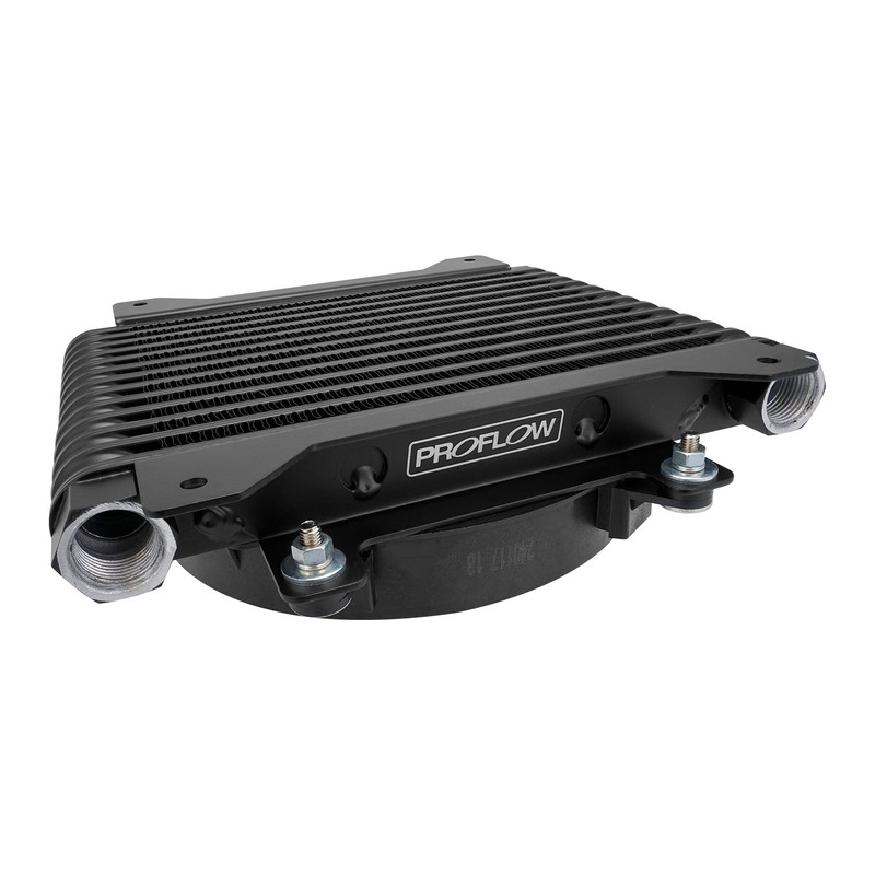Proflow’s SuperMax transmission oil cooler kit will help to increase your vehicle’s transmission life expectancy by significantly lowering operating temperatures. It has a large 32 mm thick powder coated dual core with an integrated mounting bracket and AN10 male connections. It also comes complete with a efficient 350 CFM 7” Panasonic electric fan already mounted, which is huge airflow for such a compact fan, so all you have to do is find a spot to mount it on your car! This kit also includes an thermal activation switch and pigtail.
