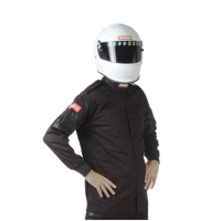 The RaceQuip 111 series single-layer SFI-1 racecar driver's fire suit jacket is made from Pyrovatex® FRC material. Note that sometimes this material is referred to as "fireproof", but all auto racing safety gear is "fire retardant". Pyrovatex® offers the maximum combination of overall flame and heat protection, durability and comfort for the price. This fire-retardant cotton based (FRC) material is used because it retains the softness and breathability of cotton and will wick away moisture from the skin. Pyrovatex® fabric is gentle and non-irritating to even the most sensitive skin. The treatment process leaves the exterior surface shiny and supple. Since the Pyrovatex® process combines a chemical agent with the raw cotton fibers to create a bond at the molecular level, with proper care, the jacket will retain its flame-retardant properties beyond the useful life of the garment. All driving jackets are assembled with heavy-duty, multi-needle, over-lock safety stitch machines to provide exceptional seam strength. All RaceQuip jackets feature a high-quality heavy duty Nomex® backed brass zipper installed with a double overlap for a more secure front opening. Stylish contrasting armband stripes match the full-length leg stripes found on RaceQuip driving pants.