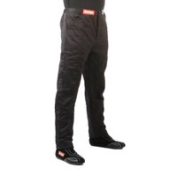 The RaceQuip 122 series multi-layer SFI-5 racecar driver's fire suit pants are made up of an outer layer of durable Pyrovatex® FRC, backed by a layer of Nomex®, then lined by another layer of Pyrovatex®. Note that sometimes these materials are referred to as "fireproof", but all auto racing safety gear is "fire retardant". Pyrovatex® offers the maximum combination of overall flame and heat protection, durability and comfort for the price. This fire-retardant cotton based (FRC) material is used for the inner and outer layers because it retains the softness and breathability of cotton and will wick away moisture from the skin. Pyrovatex® fabric is gentle and non-irritating to even the most sensitive skin. The treatment process leaves the exterior surface shiny and supple. Since the Pyrovatex® process combines a chemical agent with the raw cotton fibers to create a bond at the molecular level, with proper care; the pants will retain their flame-retardant properties beyond the useful life of the garment. The middle layer consists of Nomex(R) batting which is an inherently fire-retardant aramid fabric. All racing pants are assembled with heavy-duty, multi-needle, over-lock safety stitch machines to provide exceptional seam strength.