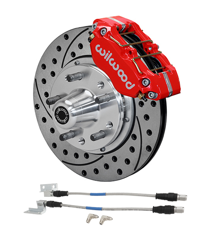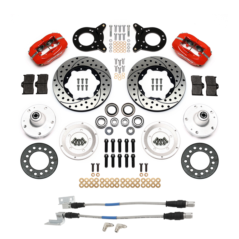 Wilwood's new DP-DB Pro-Series Front Hub Kits offer disc brake upgrade solutions for OEM spindles. We have completely redesigned our Pro Series line of brake kits using a larger 11" rotor and new forged aluminum hubs with the express purpose of maintaining the factory wheel position. Based on the venerable Forged Dynapro Dust boot caliper, these kits were developed for applications or locations that require or prefer a dust-sealed piston. Dust-booted aluminum pistons provide added protection against road or track born dirt and debris on low to intermediate temperature range applications that may also operate in harsh environments. Most vehicle applications require no modifications for installation, and provide plenty of clearance inside popular 15" wheels. DP-DB Pro-Series kits can be used with either manual or power boost master cylinders. Kits come complete with calipers, rotors, hub assembly, brackets and hardware. Kit installation requires purchase of additional brake lines shown below.